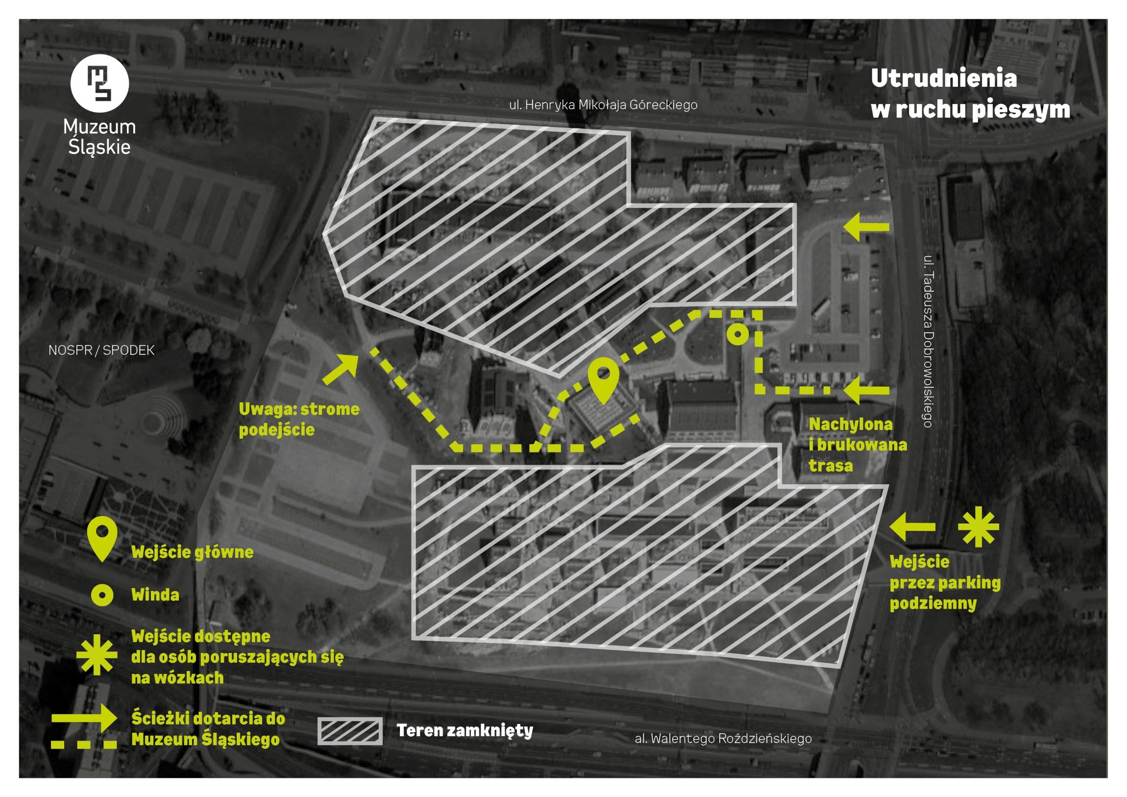 Na terenie muzeum nadal prowadzone są prace budowlane, dlatego zmieniona została organizacja dojścia do kompleksu. Rekomendowana trasa prowadzi od strony parkingu przy ul. Dobrowolskiego oraz od strony NOSPR-u. Wyłączone z użytkowania pozostaje przejście pod wieżą szybu Warszawa.
