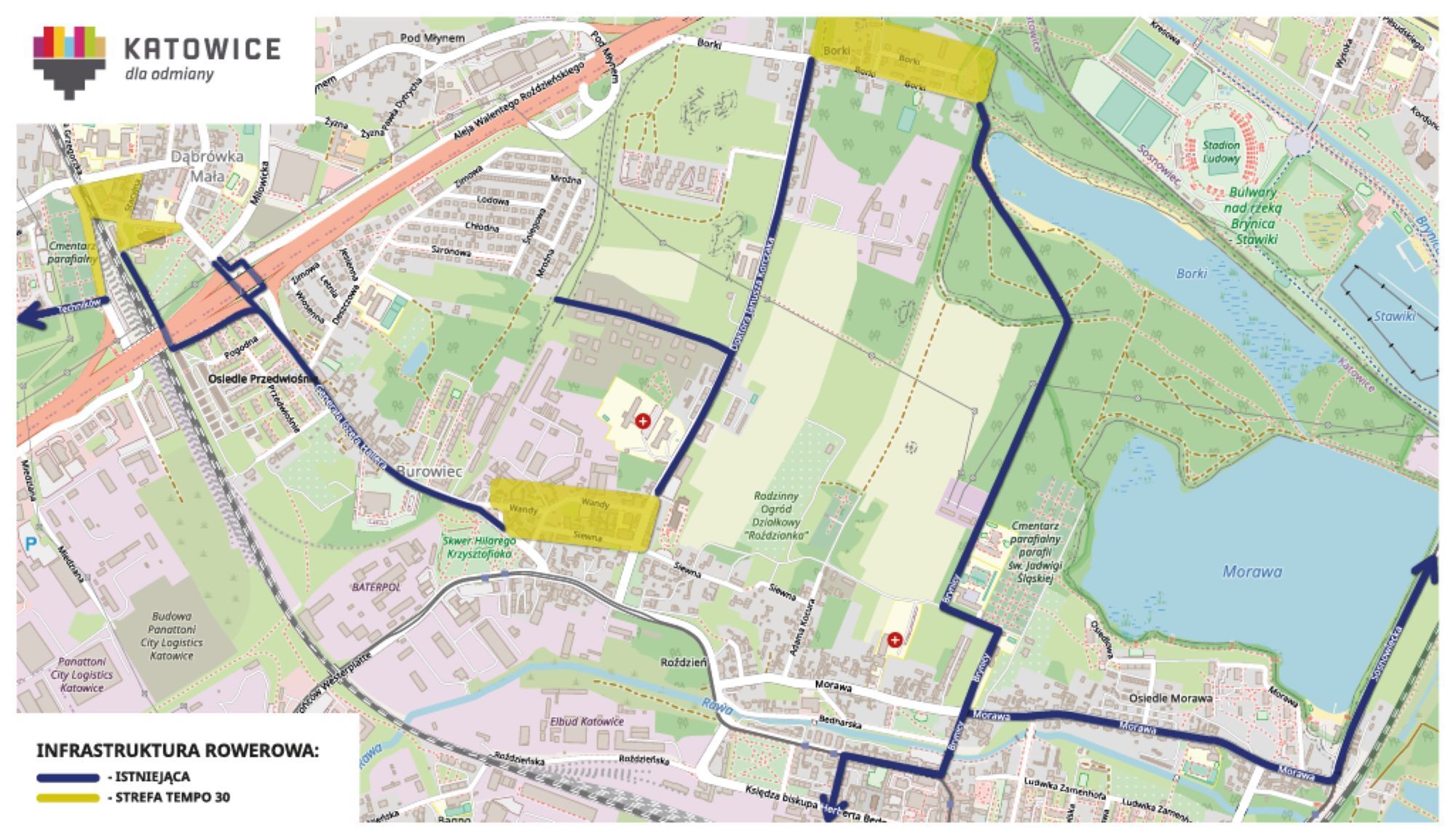Wybudowany właśnie blisko kilometrowej długości odcinek infrastruktury rowerowej poprowadzony został wzdłuż ul. Morawa, pomiędzy skrzyżowaniami z ul. Brynicy oraz z ul. Sosnowiecką.