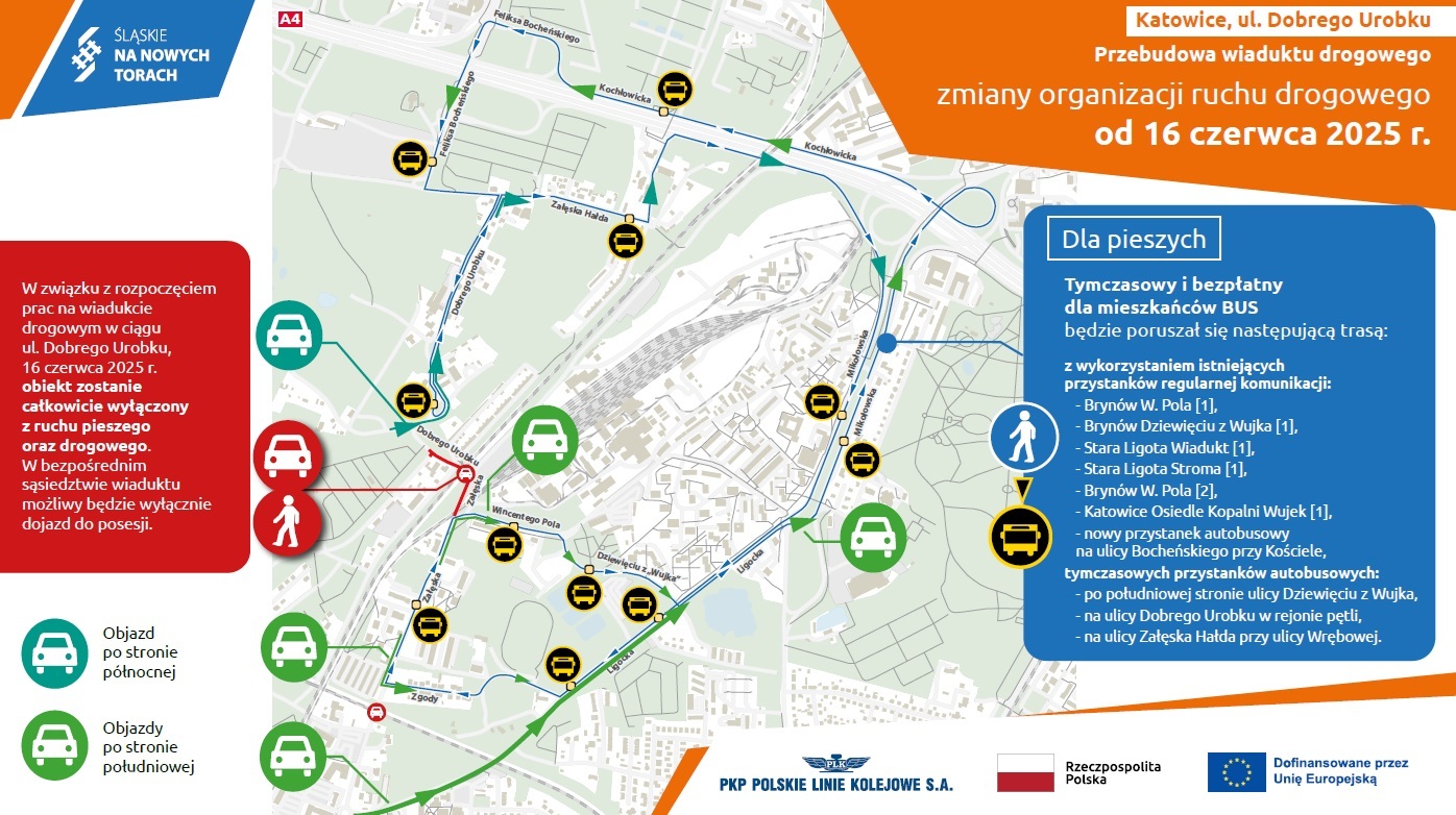 PKP Polskie Linie Kolejowe S.A. wydały dzisiaj komunikat dotyczący zmian w organizacji ruchu na ul. Dobrego Urobku w Katowicach.