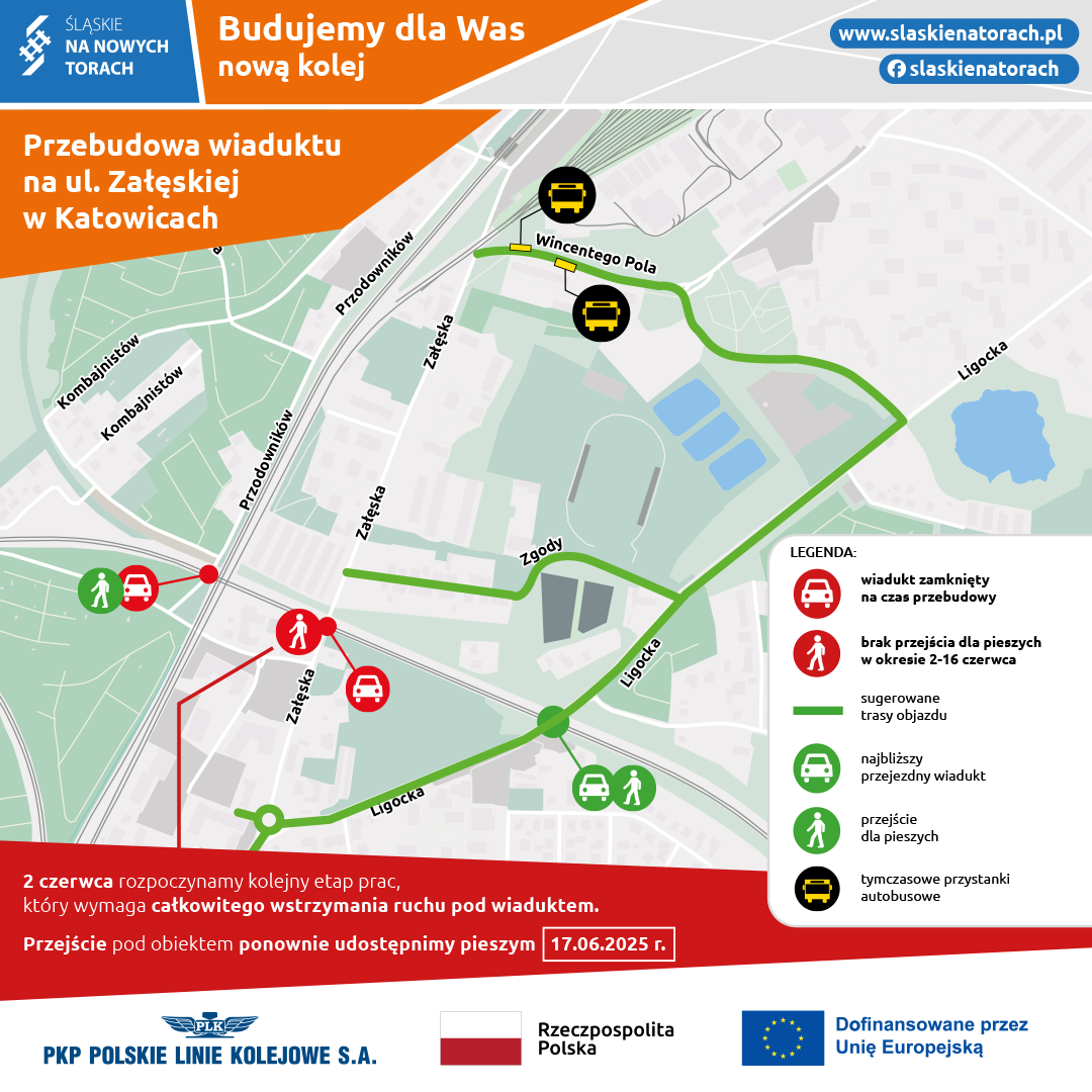 PLK rozpoczynają kolejny etap prac na wiadukcie kolejowym przy ul. Załęskiej w Katowicach. Wykonawca rozebrał stary obiekt wraz z fundamentami, a w jego miejsce wybudował nowe podpory. Obecnie montowana jest stalowa konstrukcja nowego wiaduktu. Jednocześnie, rozpoczęły się prace związane z budową nasypu kolejowego. Ich zakres musi zostać zrealizowany przy wstrzymanym ruchu pieszych. Z tego powodu przejście na ul. Załęskiej w Katowicach będzie zamknięte od 2 do 16 czerwca 2025 roku. Już 17 czerwca piesi znów będą mogli korzystać z przejścia przez plac budowy i tak ma pozostać już do końca realizacji tej inwestycji.